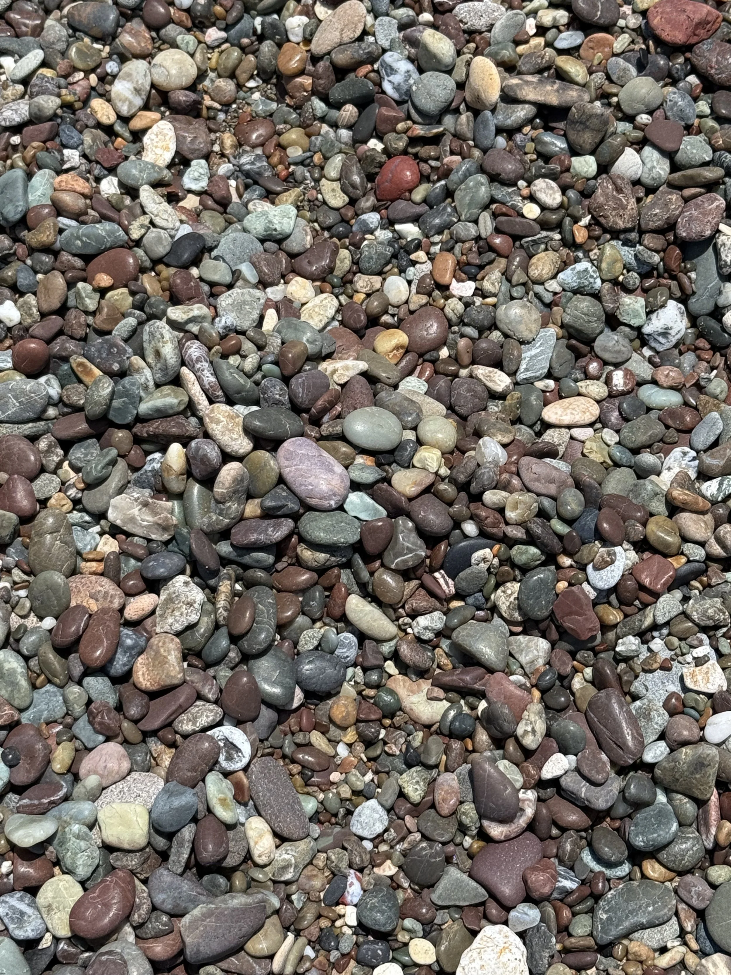 Close-up photo of multicolored small and medium-sized smooth rocks and pebbles on the ground.